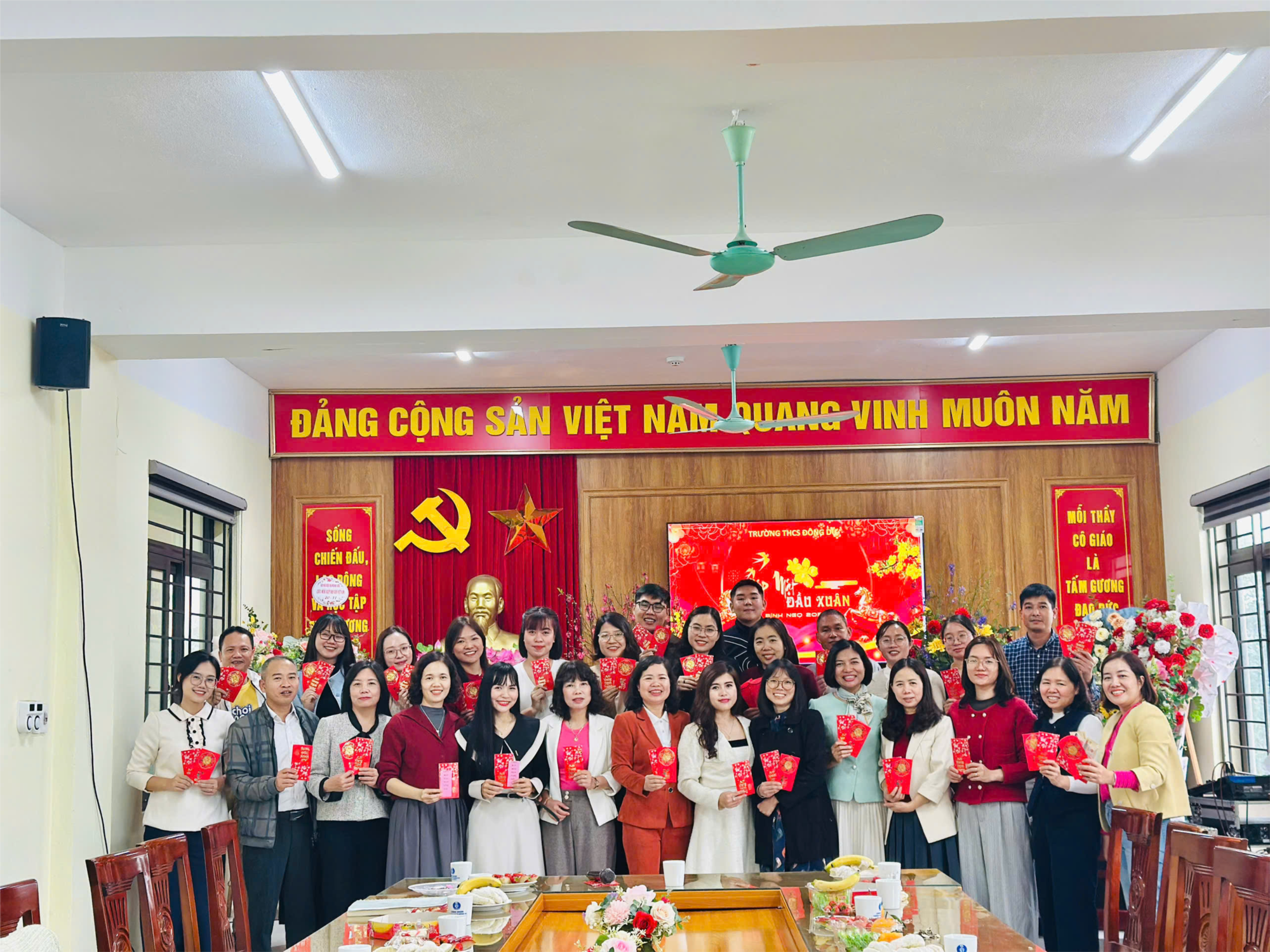 Mở đầu chương trình, nhà giáo Nguyễn Thị Lan - Bí thư Chi bộ, Hiệu trưởng nhà trường - gửi lời chúc mừng năm mới tới toàn thể Hội đồng Sư phạm cũng như tổ chức lễ mừng tuổi đầu năm cho cán bộ, giáo viên, nhân viên tại buổi Gặp mặt đầu Xuân. Thay mặt Ban giám hiệu nhà trường, nhà giáo bày tỏ mong muốn chia sẻ niềm vui gặp gỡ trong ngày làm việc đầu năm mới với các thầy cô giáo, đặc biệt hy vọng trường THCS Đông Dư sẽ đạt nhiều thành tích khởi sắc trong giai đoạn tiếp theo của năm học 2025 - 2026, toàn thể các thầy cô giáo, cán bộ, nhân viên cùng gia đình xuân mới thật nhiều sức khỏe, hạnh phúc và bình yên. Những cố gắng được ghi nhận và động viên kịp thời khiến các thầy cô đều phấn khởi, từ đó tiếp thêm động lực cho một năm mới làm việc hiệu quả hơn. Bên cạnh lời chúc ý nghĩa, những chiếc phong bao tươi thắm đã được nhà giáo trân trọng trao tặng từng thành viên trong Hội đồng nhà trường như món quà ngày Xuân chân thành, đầy tình thân ái khiến ai nấy đều cảm động.