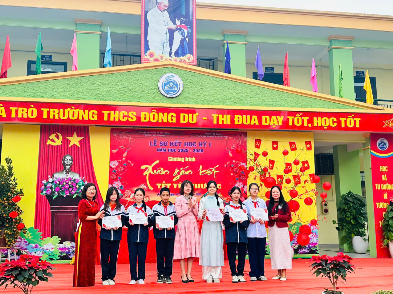 Bên cạnh đó, nhân dịp Tết Nguyên đán Bính Ngọ sắp đến, trường THCS Đông Dư đã trao tặng những phần quà ý nghĩa cho các em học sinh có hoàn cảnh khó khăn. Đó không chỉ là hoạt động mang giá trị vật chất mà còn thể hiện sự quan tâm, chia sẻ của nhà trường đối với các em trong dịp Tết đến, Xuân về.