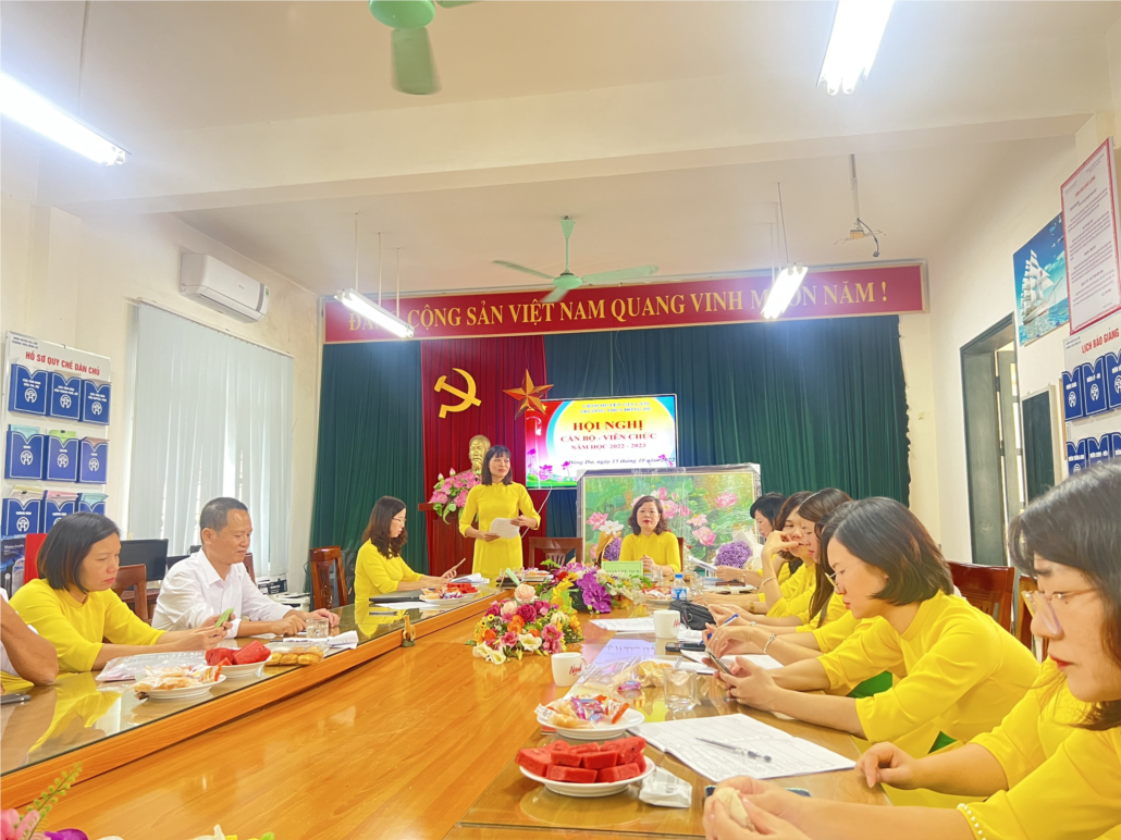 Dưới sự chủ trì của Đoàn Chủ tịch, Hội nghị cán bộ công chức, viên chức năm học 2022 - 2023 diễn ra sôi nổi, tích cực. Hội nghị đã thông qua báo cáo kiểm điểm chủ trương của Đảng, pháp luật của Nhà nước liên quan đến thực hiện những việc làm được và chưa làm được của năm học 2021 - 2022 và phương hướng, nhiệm vụ năm học 2022 – 2023 ; Báo cáo tổng kết phong trào thi đua năm học 2021 - 2022 và phương hướng, nhiệm vụ năm học 2022- 2023; Báo cáo hoạt động của Ban thanh tra nhân dân năm học 2021 – 2022 , chương trình hoạt động năm học 2022 - 2023;