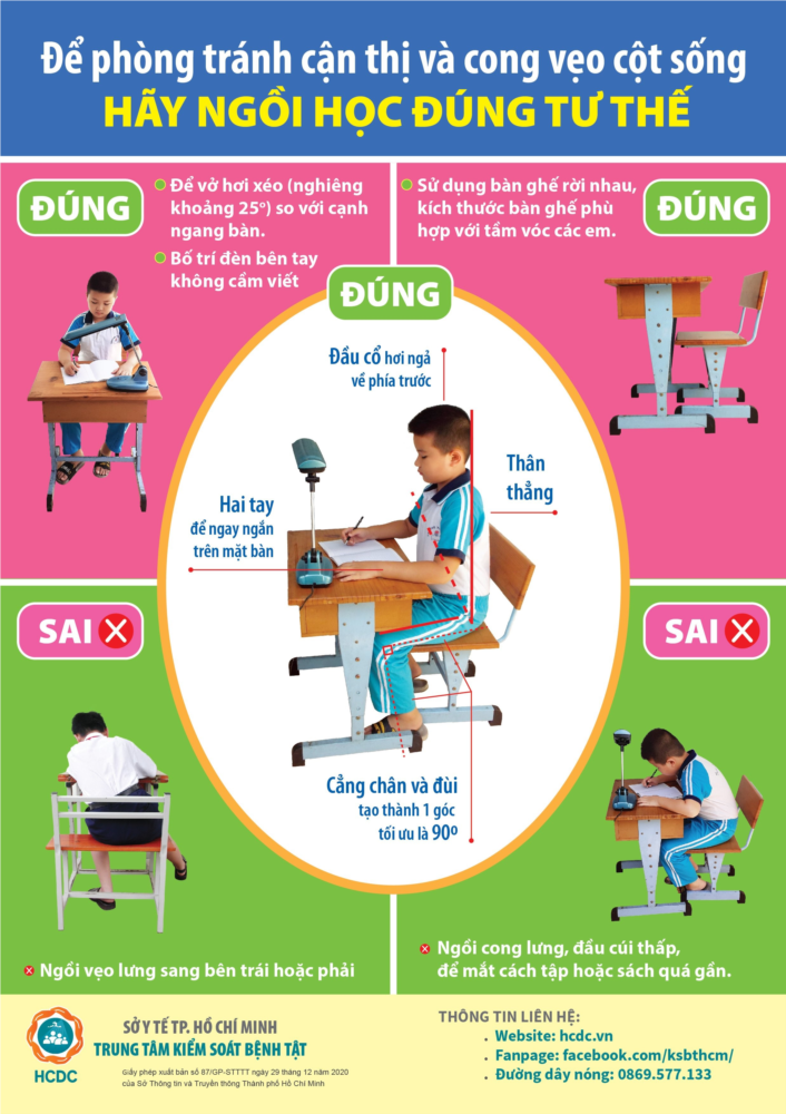 Đảm bảo ngồi học đúng tư thế: khi ngồi, hai bàn chân được đặt ngay ngắn, vững chắc trên sàn, giữa cẳng chân và đùi tạo thành 1 góc tối ưu là 900 (dao động trong khoảng 75-1050), lưng có thể tựa vào tựa lưng của ghế để tăng thêm điểm tựa, thân thẳng, đầu và cổ hơi ngả về phía trước, hai tay để ngay ngắn trên mặt bàn.